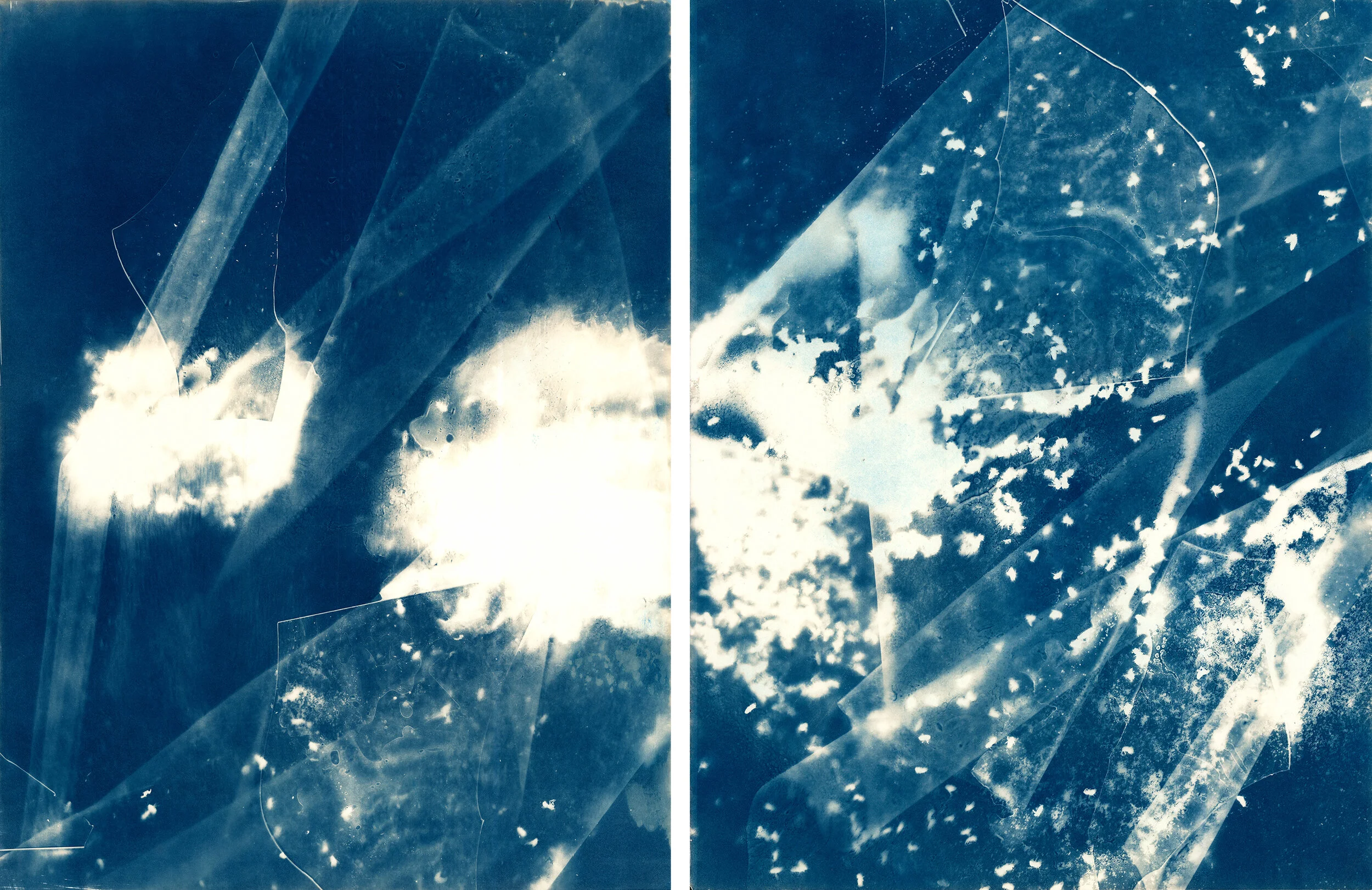 This project is a collaboration with living honeybees (and in some images dead honeybees), resulting in large works on paper. The images are life size contact prints made in the sun (not from a digital negative). Incorporating aspects of printmaking, photography and drawing these images were made using organic components and the presence of honeybees. Each blueprint is a record of light, time and labor. In the fleeting moments that pass during exposure, bees move and vibrate. This movement causes the bees to appear as little ghosts, or soft glowing orbs of light. Their presence is recorded over long exposures.